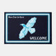 Ein einfaches, leuchtendes, blau-weiß-zeiliges Bild eines Raven (Corvus corax) auf einem sternenförmigen Hintergrund. Auch "WELCOME" wird angezeigt und es gibt einen zusätzlichen Platz, wo Sie Ihren eigenen Text hinzufügen können.