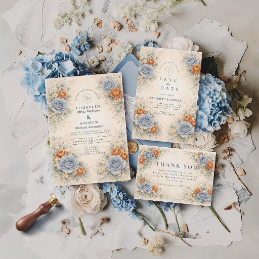 This romantic wedding design features soft blue and peach florals arranged in a delicate garden composition. Inspired by wildflowers and classic botanical illustrations, the artwork blends muted neutrals with airy florals for a timeless, refined look. The elegant layout and gentle color palette make it ideal for couples planning a nature-inspired wedding with a graceful, understated aesthetic that feels both modern and enduring.