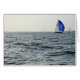 Ein markantes blaues Segel hebt sich von einem Abend Himmel und Wasser ab.