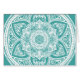 Dieses weiße Mandala liegt auf einem aquamarinen, hellen Hintergrund. Die Farbe ist beruhigend und harmonisch. Teil der Sammlung Bardh Mandala.