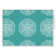 Dieses weiße Mandala sitzt auf einem aquamarinen, hellen Hintergrund. Die Farbe ist beruhigend und harmonisch. Teil der Sammlung Mola Mandala.