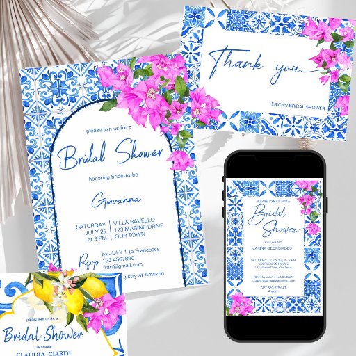 blaue fliesenbougainvilleaelegantmediterrangriechischsantorinimykonosthematisches brautpartykochkarterezeptorkarte