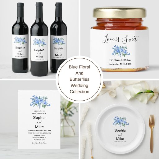 Blue Watercolour Floral and Butterflies Wedding Weinetikett