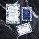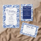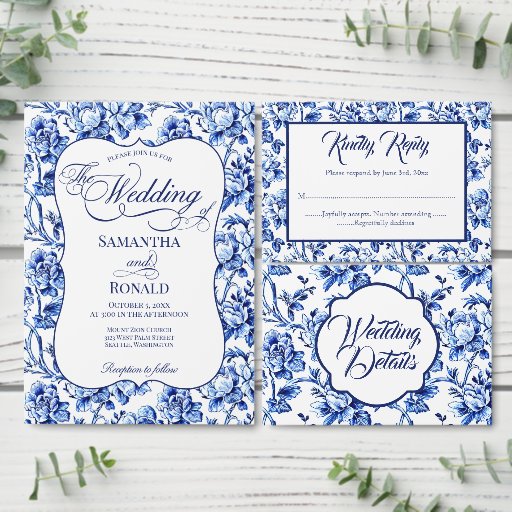 A wedding invitation featuring a blue and white floral toile design with calligraphy elements.