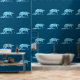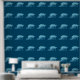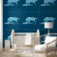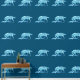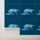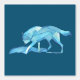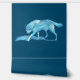 Ein stylisierter blauer Wolf (Canis lupus) wirft einen Schatten, wenn er durch schneebedecktes Gelände geht.