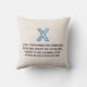 A detailed blueprint-style illustration of the letter X is presented against a vibrant blue background. The letter itself is rendered in white, with intricate details and precise measurements indicated by thin white lines. The back of the pillow includes a blue outline of the letter X set against a textured light beige background with a 4-line poem about the letter below.