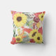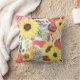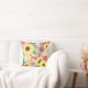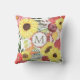Hier ist ein hübsches Kissen mit einem kühnen Blumenmuster in den Farben Rosa, Violett, Weichgrün, Braun und Hellgelb. Große, helle Sonnenblumen sind die Hauptattraktion. Das farbenfrohe Muster liegt auf einem weißen Hintergrund. Die Rückseite des Kopfkissens hat das gleiche Muster, aber mit einem weißen kreisförmigen Banner, das in violettem Rosa und Graugrün kontrastiert. Ihr Monogramm steht im Zentrum.