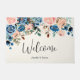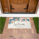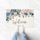 Eine willkommene Tür mit hübschen, rosa und blauen Rose und grünen Blätter. Set auf hellgelbem Hintergrund.