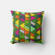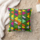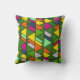 Dieses Kissen hat ein modernes Design aus überlappenden Dreiecken in Blumenfarben, die vertikal auf einem grünen Feld verlaufen.