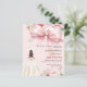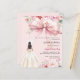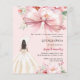 Ein eleganter rosa Hintergrund mit rosa, rosafarbenem Bogen, rosa Blume und einem Mädchen in einem cremefarbenen Kleid. Personalisieren und fügen Sie einen Namen und Party-Details hinzu. 1 Blatt = 1 Einladung mit Druckkante bis Kante.