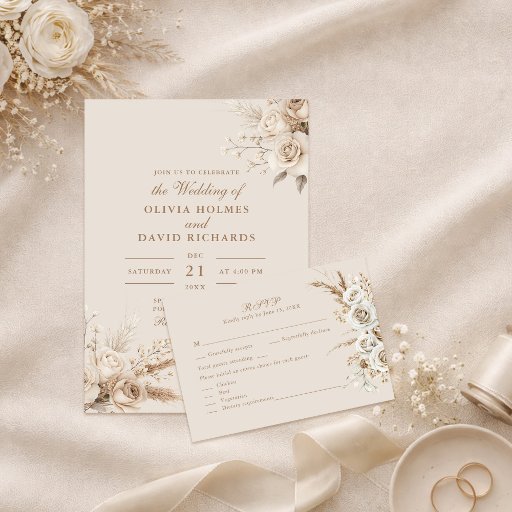 Begleiten Sie Ihren Tag mit dieser eleganten Hochzeitskarte, die in warmen Beige-Tönen gestaltet und mit getrockneten Blume und weißen Rosen geschmückt ist. Diese Karte ist ideal, um die Zeremonie Ordnung, Brautparty Namen oder eine herzliche Botschaft an die Lieben zu teilen. Seine sanften Blumenbilder fügen eine romantische und Bio Touch hinzu, die sich wunderbar mit rustikalen, minimalistischen oder Gartenhochzeiten verbindet. Alle Bereiche sind vollständig editierbar, sodass Sie den Inhalt auf Ihre individuelle Feier zuschneiden können. Vervollständigen Sie Ihre Hochzeitssuite mit anderen passenden Stücken aus der Boho Beige Dried Blume und der White Roses Wedding Collection für ein glänzendes und einheitliches Aussehen.