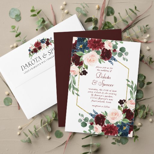 Radiante handbemalte Gartenhochzeit, Dusche oder Party-Einladungs-Suite-Einsatz mit bordeauxroten und rot-rosa Wasserfarbenkopfrahmen mit marineblauen Akzenten Blume, die mit botanischem Lorbeer und dunkelrot geschmückt sind. Dieses wunderschöne Layout aus der Kollektion "Boho Bloom" besticht durch Bohemische Wildblumen mit strahlenden Blüten und Eukalyptusblättern. Für andere Farben oder passende Produkte, besuchen Sie bitte den JustFharryn Zazzle Store, oder kontaktieren Sie den Designer, c/o Fharryn@yahoo.com Alle Rechte vorbehalten. #bohochic #zazzlemade