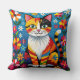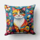 A cute cat themed throw pillow. A cute colorful boho cat sitting in flowers and surrounded by butterflies. The art is in an impasto oil paper quilling style.