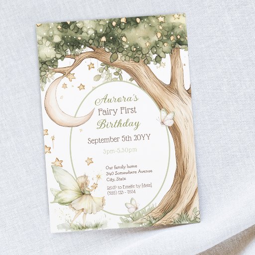 After your little one’s magical milestone send out thanks with this whimsical fairy first thank you card. Adorned with soft watercolor sweet fairy standing by an old big tree. Details of stars and the moon creates a dreamy enchanted forest vibe. With elegant fonts, a sage green and ivory palette, a truly charming and magical celebration.