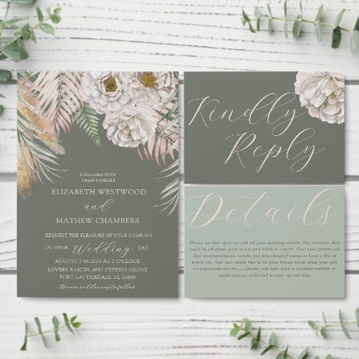 Dieses einzigartige botanische Design wurde in Aquarellfarben gemalt und ist eine originelle Illustration aus unserem Studio. Mit elegantem Pampasgras in beige und terracotta mit grünen und erdigen Palmen und Farnen mit schönen, cremefarbenen Blume. Viel Spaß beim Erstellen Ihrer perfekten Einladung.