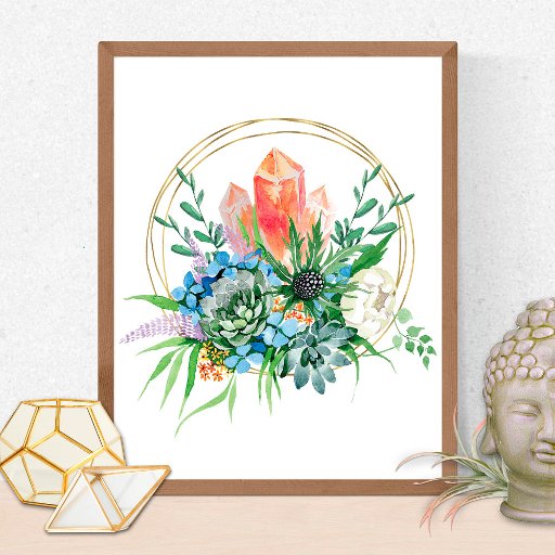 Boho Bohemisch Succulent Bouquet Watercolor Modernes Chic Design mit goldenem Kreis und Citrine Kristallen. Perfekt für Energieheiler, Reiki, Massagetherapeut, Psychik, Kartenleser, Wellness-Center Industrie. Text bereit für Ihre Informationen. Ändern Sie die Hintergrundfarben und Textstile entsprechend Ihren Anforderungen.