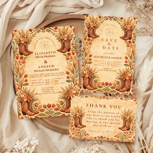 Schaffen Sie mit diesem rustikalen Western-Hochzeitsdesign den Ton für eine warme, romantische Feier. Es zeigt einen wunderschön illustrierten Gartenbogen, der von Wildblumen, Weizendetails und klassischen Cowgirl-Elementen wie Stiefeln und Hüten eingerahmt wird. Die erdigen Terrakotta-Töne und die weiche Vintage-Textur schaffen eine einladende, sonnengeküsste Ästhetik, die von Wüstenlandschaften und ländlichem Charme inspiriert ist.
