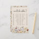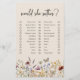 Dieses stilvolle und elegante Brautparty "würde sie lieber"-Spiel bietet wunderschöne handbemalte Aquarellfarben-Wildblumen, die als hübscher Rahmen und elegante Kalligraphie-Schrift angeordnet sind. Auf der Rückseite befindet sich ein hübsches Koordinatensystem. Suchen Sie passende Elemente in der Boho Wildblume Brautparty Collection.