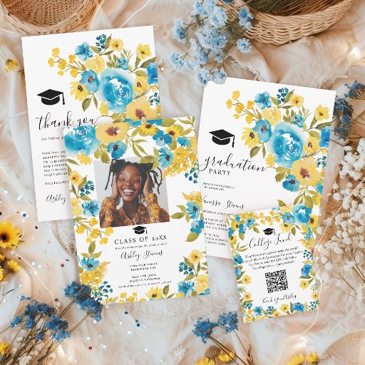 Boho Yellow and Blue Floral 3 Foto Abschluss Einladung