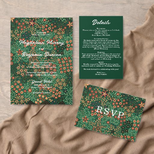 Bold Dark Green Red Floral Earthy Textile Wedding Einladung