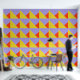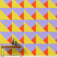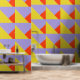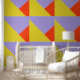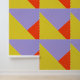 Sehr mutige Auswahl an Tapeten. Geometrische, gelbe, blaue und orange dreieckige Formen. Machen Sie eine Aussage!