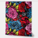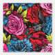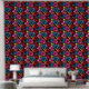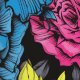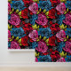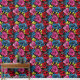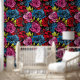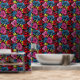 A bold maximalist pattern with bright red, pink, and blue flowers, electric green leaves, and grey goth accents.