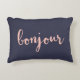 Bonjour! Mit diesem hübschen Akzent Kissen verleihen Sie Ihrem Sofa, Ihrem Bett oder Ihrem Lieblingsstuhl einen Stil. Das Design zeichnet sich durch einen tiefen marineblauen Hintergrund mit "Bonjour" in peachy rosa handgeschriebenem Skript aus. Verwenden Sie das optionale Personalisierungsfeld, um einen Namen, ein Monogramm oder eine Nachricht auf der Rückseite des Kopfkissens hinzuzufügen.