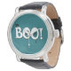 Boo! Textdesign zu Halloween mit Katz, Spinne, Eule und Spinnennetz Dekoration auf grunblauem Hintergrund.