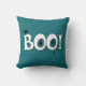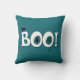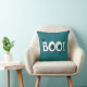 Boo! Textdesign zu Halloween mit Katz, Spinne, Eule und Spinnennetz Dekoration auf grunblauem Hintergrund.