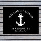 Eine schicke, moderne nautische Tür für Ihr Boot, die eine weiße Abbildung eines Ankeres auf schwarzem Hintergrund zeigt. Sie können den Text "Welcome Abard" und den Namen und die Lage Ihres Bootes in eleganter weißer Typografie personalisieren.