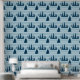 Blaue horizontale Streifen stehen für Meereswellen mit silhouetted dunkelblauen Segelbooten und Schiffen.