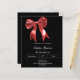 Ein schwarzer Hintergrund, mit einem großen roten Bogen verziert. Personalisieren und fügen Sie einen Namen und Party-Details hinzu. Weißer Text. 1 Blatt = 1 Einladung mit Druckkante bis Kante.