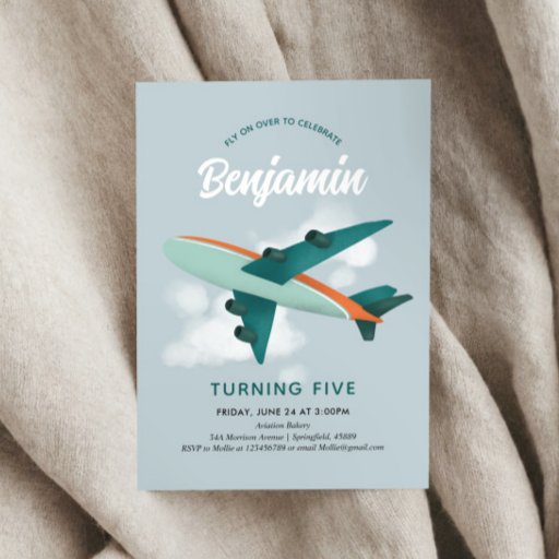 Dieses coole und moderne Jungs reisen Geburtstags Begrüßungsbannerdesign mit einer Airplane-Illustration, mit blauem Himmel und Wolken, und kann mit dem Namen und dem Alter Ihres Kindes personalisiert sein. Die perfekte Dekoration mit blauen Flugzeugen zum 5. Geburtstag, aber für jedes Alter individuell gestaltet.