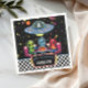 This Out of This World custom sign features a cute green alien with planets, stars, and a UFO in a fun retro neon space style. Personalize with your own text for your space themed birthday party.