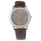 Die Armbanduhr dieser Männer hat ein geometrisches Design, eine Art flacher Ovale, die sich durch das Design in hellblau auf einem braunen Feld wiederholen.