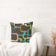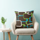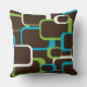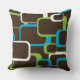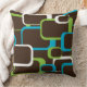 Ein farbenfroher Entwurf von Kalkgrün, Weiß und Türkis-Blau Retro inspirierte Quadrate vor einem schokoladenbraunen Hintergrund auf einem Kissen werfen.
