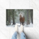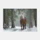 Eine Türmatte mit einem Foto eines braunen Pferdes mit einem langen weißen, scheußlichen Mane. Stehend in einem Wald mit Schneeflocken, die überall herumfallen.