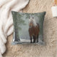 Ein Kissen mit einem Foto eines braunen Pferdes mit einer langen weißen, scheußlichen Mane. Stehend in einem Wald mit Schneeflocken, die überall herumfallen.
