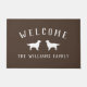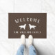 Braune Begrüßungsmatte für eine Hundefamilie, die zwei goldene Retrievers gegenüberstehen, Nase zu Nase. Willkommen in einem gewölbten Text oben. Ihr Familienname darunter in weißen Buchstaben.