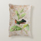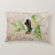 Betonen Sie Kissen mit einer Vintagen Illustration des brennenden Throated Kolibris. Ein bunter grüner und blauer Kolibri mit einer hellen rot-orange Kehle hockt auf einem Neriumoleanderstrauch mit rosa Blumen, auf einem elfenbeinfarbenen Vintagen Grungehintergrund mit GoldWirbel und BlumenSilhouetten.