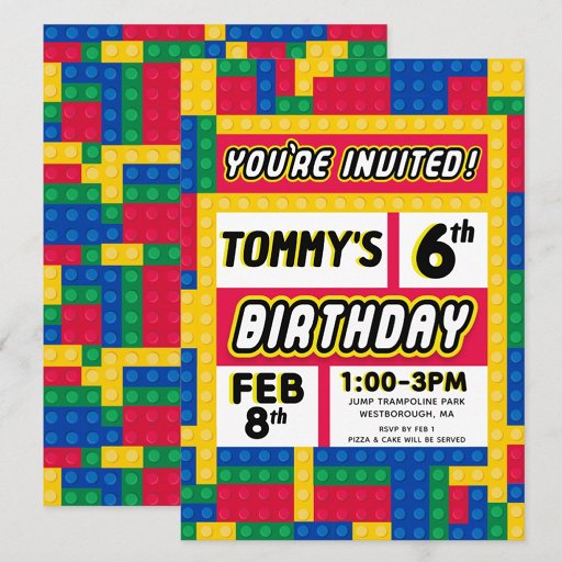 Brick Builder Customizable Birthday Invitation for your Brick Building Theme Party! Celebrate with this colorful and fun brick & block building themed Birthday Party! Complete your party with coordinating decorations, buntings, signs, favor bags, favors, favor stickers, balloons, tableware & thank you cards!