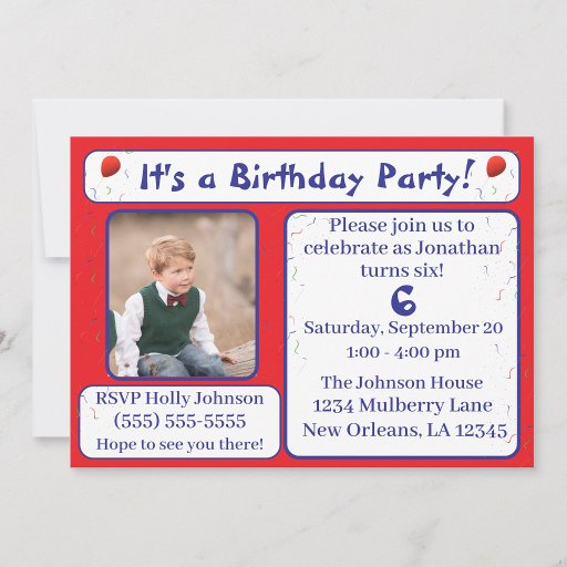 Das Design bietet gemusterte Bilder von Ballons und Konfetti vor einem weißen Hintergrund. Das Alter des Kindes wird während des gesamten Designs in leuchtend blau dargestellt.