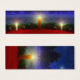 Eine 3D-Weihnachtsszene in Vue, mit Kerzen Set auf Rot vor Kieferngarten mit Rot-und Goldverzierungen. Im schneebedeckten Hintergrund stehen blau-grüne Tannenbäume vor einem strahlenden Sternenhimmel aus Fraktal. Ein funkelnder Single dominiert den Nachthimmel.