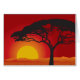Herrlicher und glänzender glühender roter Sonnenuntergang mit der Sonne, die über den grasartigen Horizont, ein einziger Bonsaisbaum oben schwebt späht.