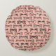 Dieses runde Kissen bietet eine Vielzahl verschiedener Brillen und Brillenrahmen in Schwarz und Weiß auf einem blassrosa.