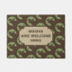 Dieses ist eine niedliche Türmatte, die für ein Kabinen- oder WaldZuhause perfekt ist. Es kennzeichnet einen Hintergrund einer braunen Elchkopf-Silhouette innerhalb eines grünen Kreisrahmens, der während des Musters wiederholt wird. Es gibt einen zusammenpassenden Aufkleber in der Mitte mit Ihrem kundenspezifischen Text. Z.Z. sagt es, dass "ELCHE HIER" WILLKOMMEN SIND, aber Sie es zu Ihrem eigenen Text leicht besonders anfertigen können