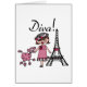 Diva-T - Shirts, Bodysuits, Tassen, Taschen, Karten, Aufkleber, Schlüsselketten, Kissen, Wanduhren und viel mehr mit einem niedlichen Divaentwurf, der ein braunes behaartes Mädchen in einem Hut und in einem rosa Kleid mit ihrem rosa Pudel nahe dem Eiffel-Turm kennzeichnet!
