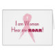Eine Ermutigungskarte für Brustkrebs. Ein schick rosa Band mit dem Text "Ich bin Frau höre mich brüllen".