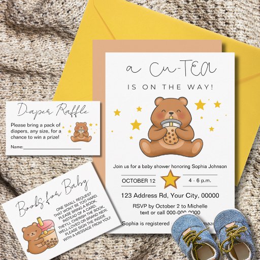 Fügen Sie diese spezielle Karteneinlage mit Ihrer Babydusche-Einladung hinzu. Bitte frag deinen Gästen, ein Buch mitzubringen, das mit einem besonderen Hinweis anstelle einer Karte signiert ist. Ein "Cu-TEA" ist auf dem Weg! Diese geschlechtsneutrale Babydusche lädt zu einem Set für eine spektakuläre Veranstaltung ein. Das Thema ist ein niedlicher Teddybär, der Boba-Tee in einem schlichten, aber elegant gestalteten Design trinkt. Verwenden Sie die Vorlage, um Ihre Daten anzupassen. Die Sterne in der Mitte können gelöscht werden, wenn Sie entweder gelb oder braun bevorzugen oder wie behalten! Jetzt holen Sie sich den Tee brauen und ließ den Spaß zu beginnen.