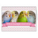 Vier hübsche junge Parkettböden (grün, blau, weiß, gelb) sind schön mit allen komplizierten Mustern auf ihrem Absturz bemalt. Die Details dieses realistischen Gemäldes sind so phantastisch, dass es für die Besitzer von Haustieren und kleinen Papageienliebhabern ein tolles Geschenk machen wird. Die Kunst wurde von Emmil Thomas gemalt.